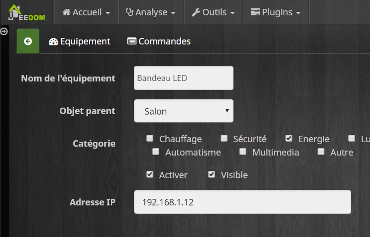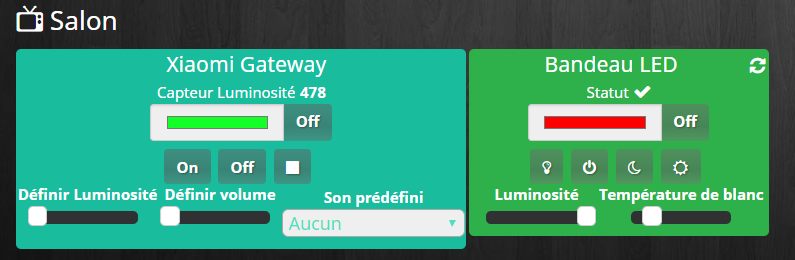 Après cette configuration très basique, vous pourrez visualiser et piloter le bandeau LED depuis le tableau de bord Jeedom :