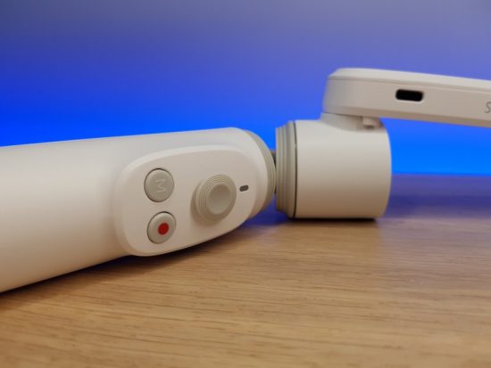 Sur la poignée du stabilisateur, il y a plusieurs boutons : le joystick directionnel pour piloter manuellement le stabilisateur, le bouton "M" pour switcher d'une simple pression du mode portrait au mode paysage (et inversement), ainsi que le bouton pour déclencher l'enregistrement. Enfin, sur le côté de la poignée, on retrouve un bouton qui sert à zoomer et dézoomer directement, ce qui est pratique.
