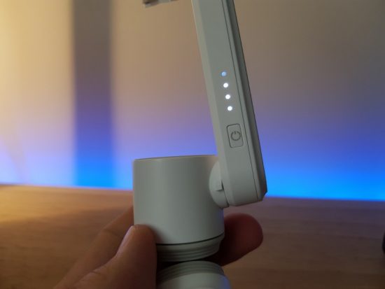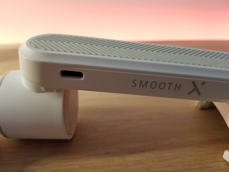 Sur le côté du stabilisateur, nous retrouvons le bouton d'alimentation on/off du Smooth-X ainsi que les quatre Leds pour indiquer le niveau de batterie restante. De l'autre côté, le port USB-C pour la recharge est présent.